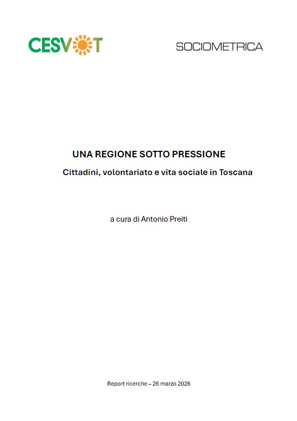 Il report Una regione sotto pressione. Cittadini, volontariato e vita sociale in Toscana presenta i risultati di un’indagine demoscopica realizzata da Sociometrica per Cesvot su un campione rappresentativo della popolazione toscana. L’obiettivo è offrire uno sguardo aggiornato sui cambiamenti sociali in atto e sul ruolo che il volontariato continua a svolgere nella vita delle comunità.